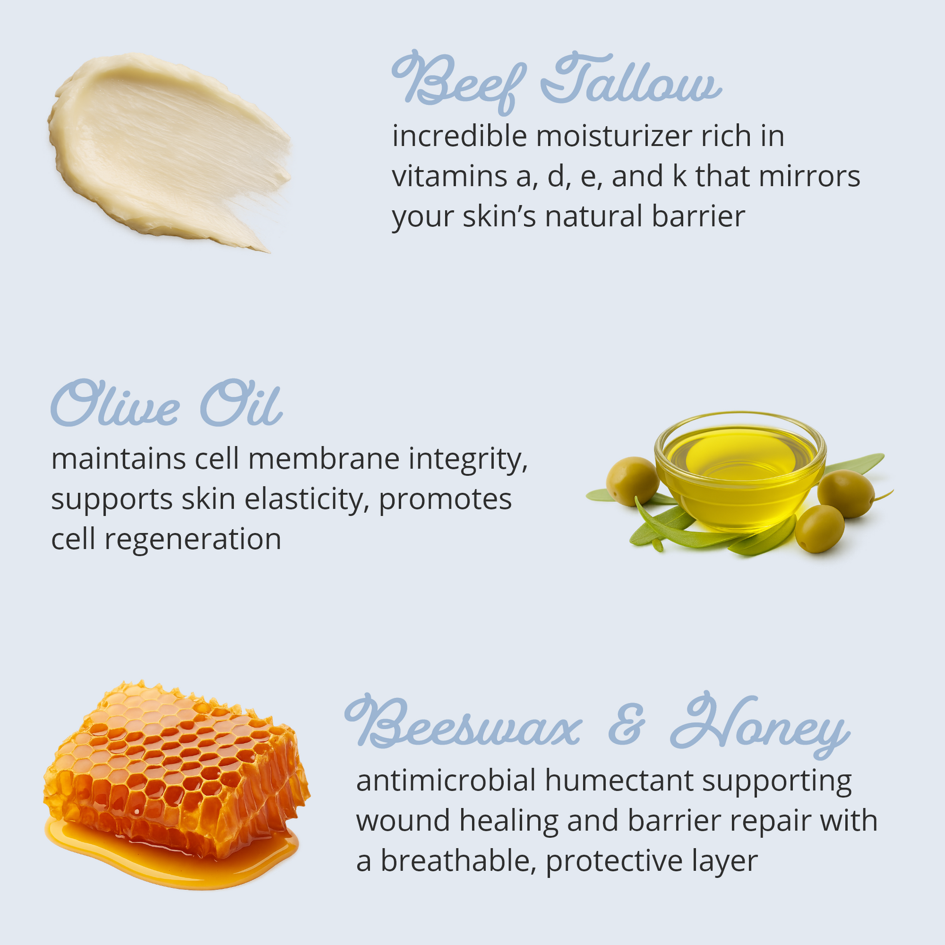 Not at all. We take great care in using rendered clean, grass-fed tallow using methods that preserve its nourishing properties while minimizing any odor. At most, you might catch a faint, buttery aroma in our Bare formula β easily masked by our essential oil blends.